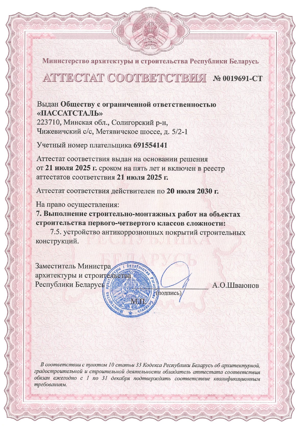 Аттестат на выполнение антикоррозионных работ